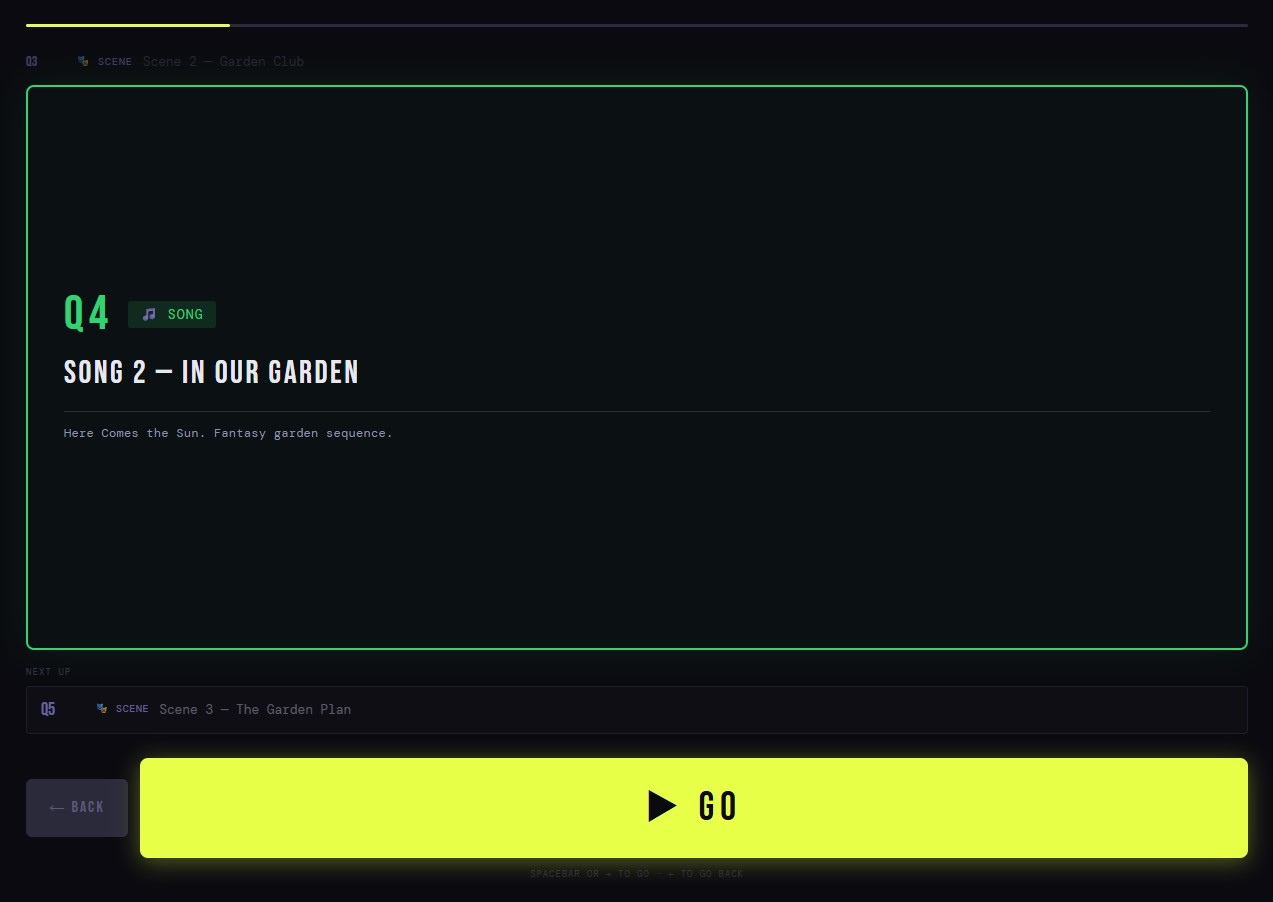 Fire every cue in sequence. Spacebar to GO — nothing missed, nothing out of order.
