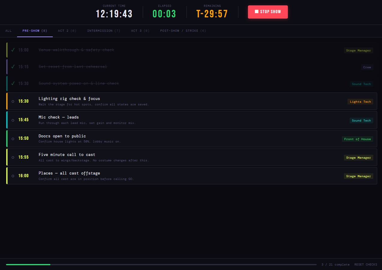 Full show day timeline with live clock, elapsed timer, role assignments, and one-tap checkoffs for every task.