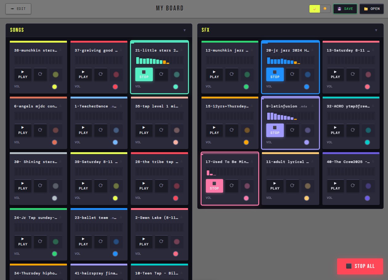 Touch-optimised sound pad. Drag to sort, per-card VU meters, loop controls, and cloud layout saving across devices.